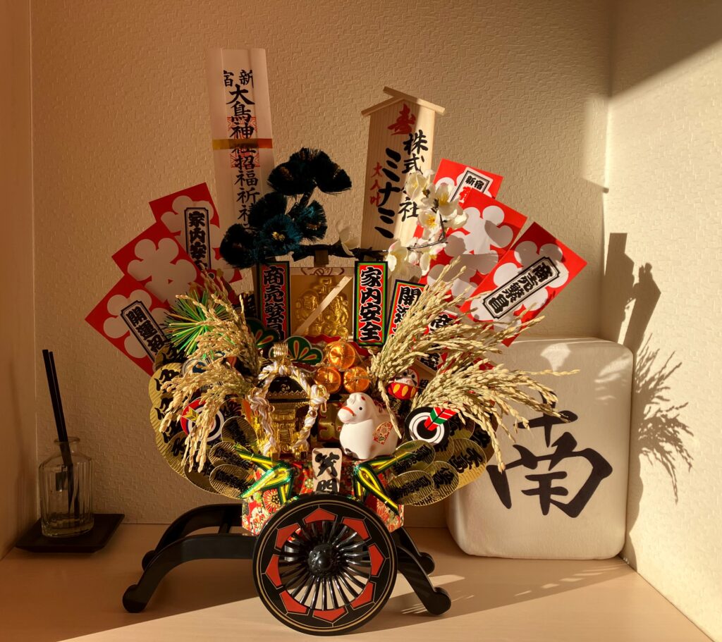 ミナミで買っているのは、花車に乗って干支の人形や稲穂、水引、小判などで飾られた、華やかでかわいらしい熊手。